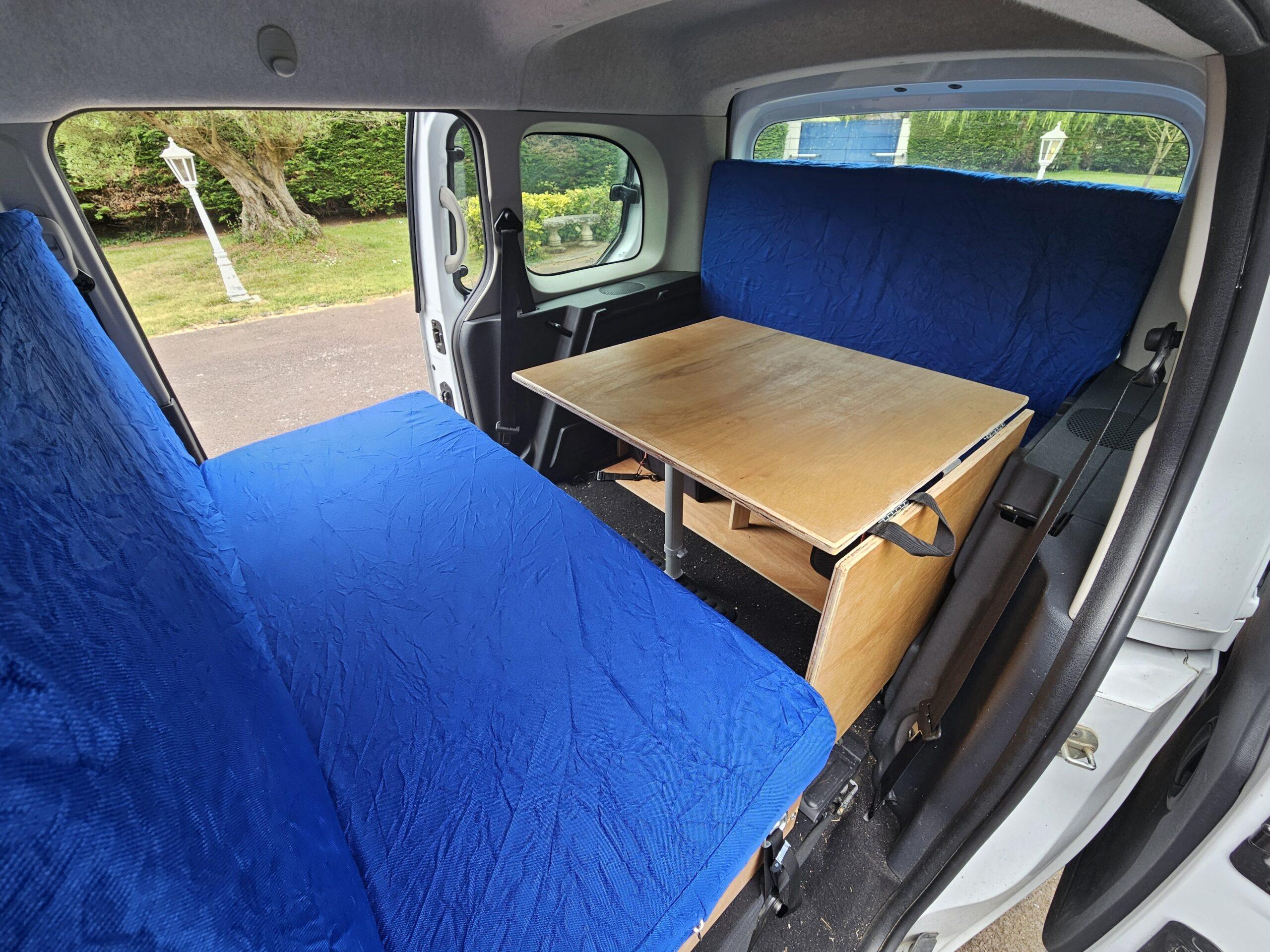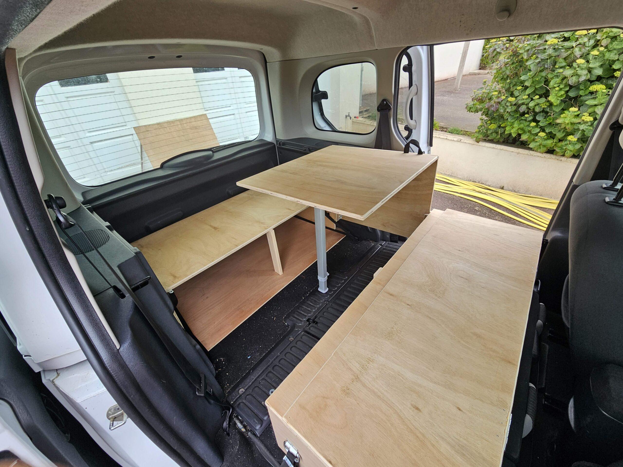 Le kit comprend un module arrière et un module avant (fixés dans le kangoo à l’aide de sangles) qui vont faire office de base de sommier ou de banquette pour s’asseoir. Le plateau permet de faire une table pour cuisiner et manger à l’extérieur sous le hayon ou à l’intérieur en cas de pluie.